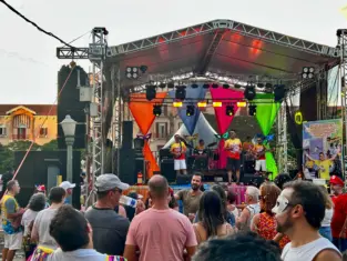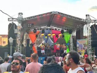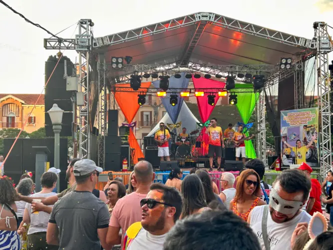 A guitarra baiana da banda Frevo na Fobica está animando o carnaval poços-caldense na praça Pedro Sanches. O grupo é uma das principais atrações da programação.